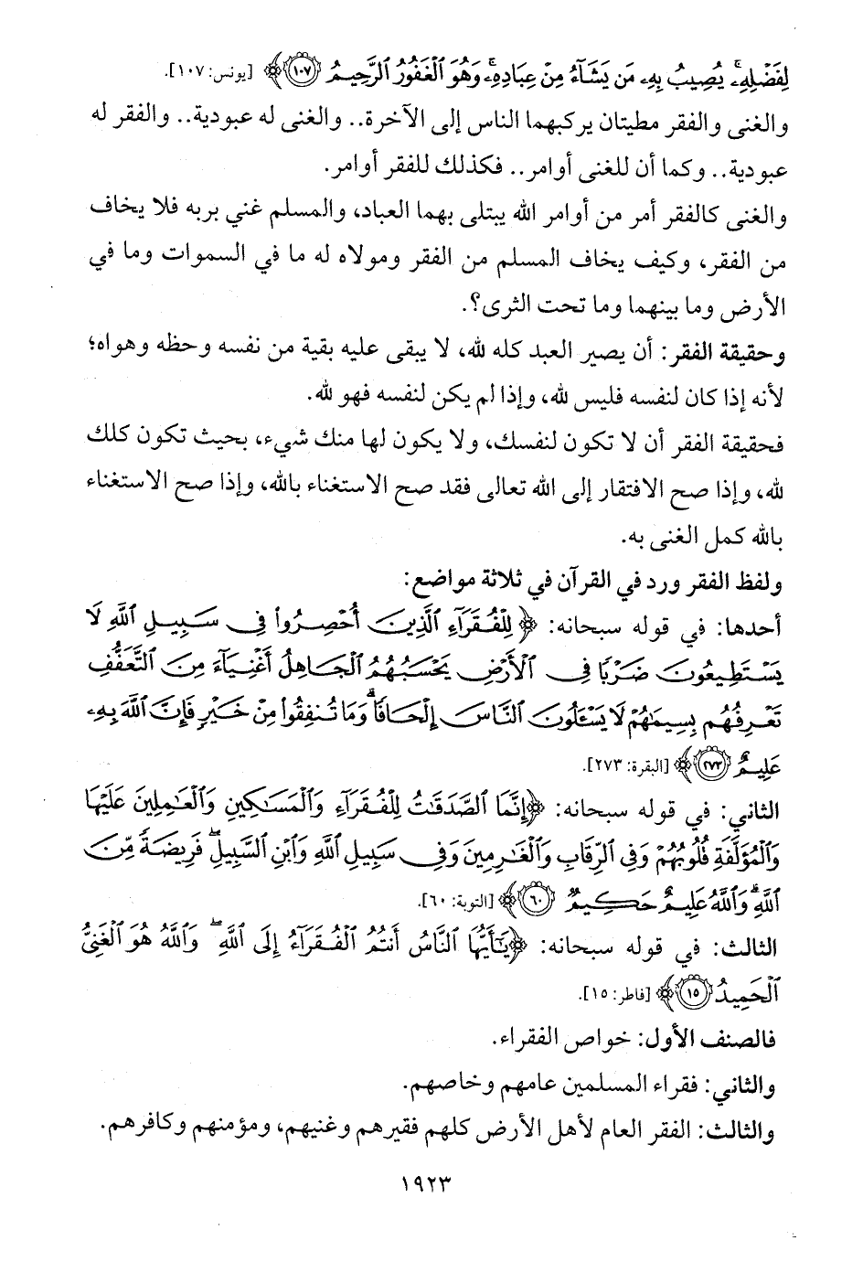 وحقيقة الفقر: أن يصير العبد كله لله، لا يبقى عليه بقية من نفسه وحظه وهواه؛ لأنه إذا كان لنفسه فليس لله، وإذا لم يكن لنفسه فهو لله.