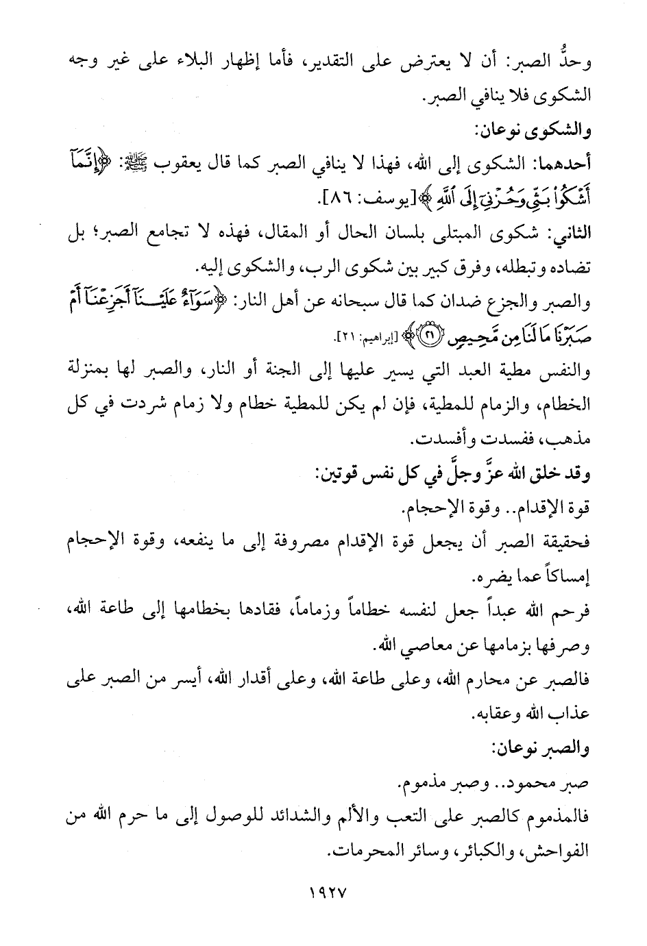 الثاني: شكوى المبتلى بلسان الحال أو المقال، فهذه لا تجامع الصبر؛ بل تضاده وتبطله، وفرق كبير بين شكوى الرب، والشكوى إليه.