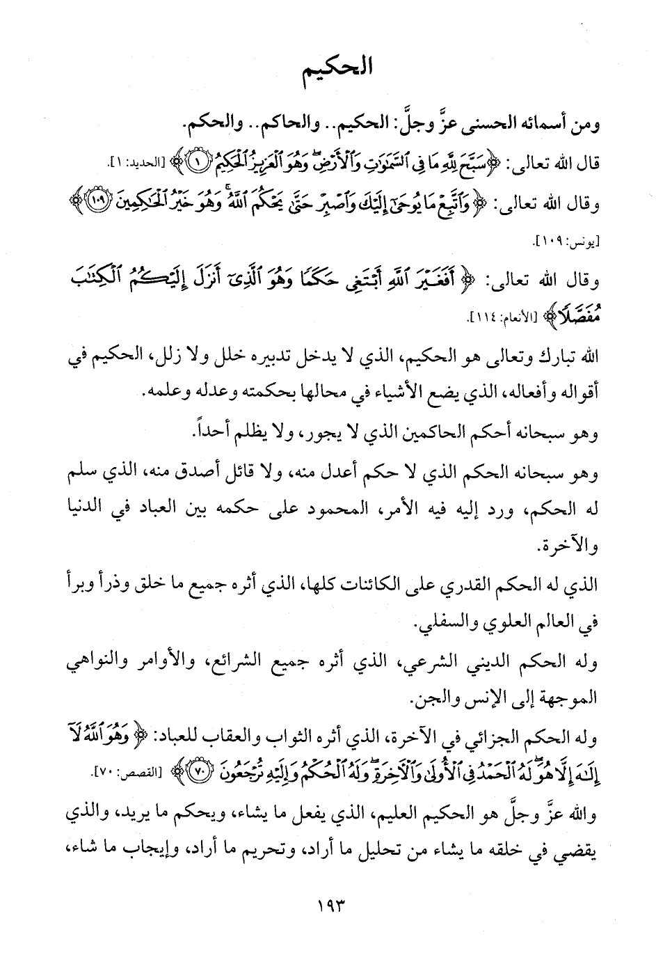 الله تبارك وتعالى هو الحكيم، الذي لا يدخل تدبيره خلل ولا زلل، الحكيم في أقواله وأفعاله، الذي يضع الأشياء في محالها بحكمته وعدله وعلمه.