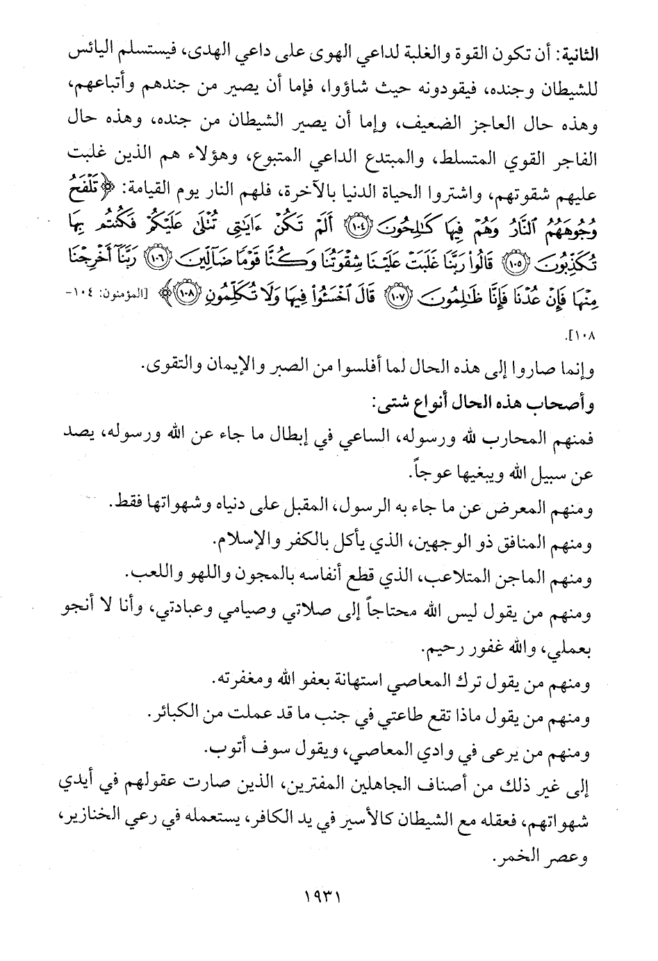 الثانية: أن تكون القوة والغلبة لداعي الهوى على داعي الهدى، فيستسلم اليائس للشيطان وجنده، فيقودونه حيث شاؤوا، فإما أن يصير من جندهم وأتباعهم، وهذه حال العاجز الضعيف، وإما أن يصير الشيطان من جنده، وهذه حال الفاجر القوي المتسلط، والمبتدع الداعي المتبوع، وهؤلاء هم الذين غلبت عليهم شقوتهم، واشتروا الحياة الدنيا بالآخرة، فلهم النار يوم القيامة: {تَلْفَحُ وُجُوهَهُمُ النَّارُ وَهُمْ فِيهَا كَالِحُونَ (104) أَلَمْ تَكُنْ آيَاتِي تُتْلَى عَلَيْكُمْ فَكُنْتُمْ بِهَا تُكَذِّبُونَ (105) قَالُوا رَبَّنَا غَلَبَتْ عَلَيْنَا شِقْوَتُنَا وَكُنَّا قَوْمًا ضَالِّينَ (106) رَبَّنَا أَخْرِجْنَا مِنْهَا فَإِنْ عُدْنَا فَإِنَّا ظَالِمُونَ (107) قَالَ اخْسَئُوا فِيهَا وَلَا تُكَلِّمُونِ (108)} [المؤمنون: 104 - 108].