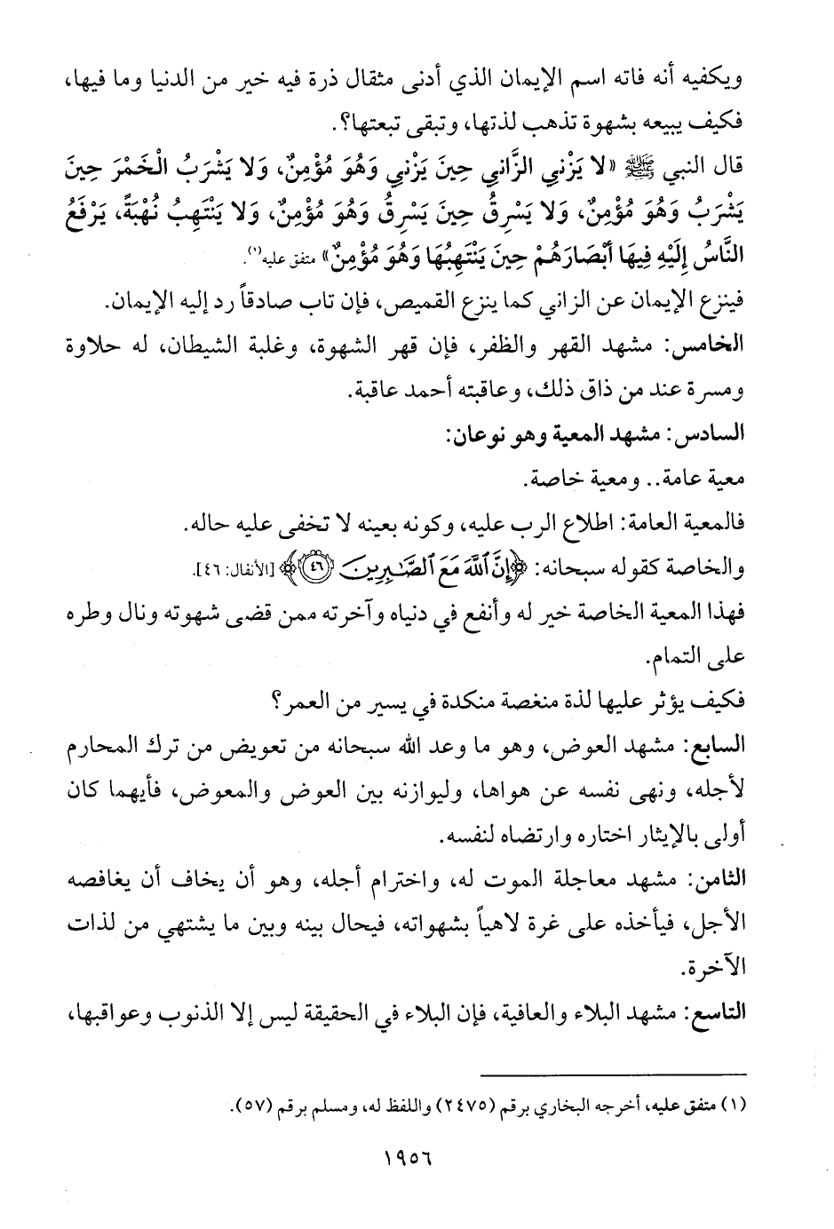 السابع: مشهد العوض، وهو ما وعد الله سبحانه من تعويض من ترك المحارم لأجله، ونهى نفسه عن هواها، وليوازنه بين العوض والمعوض، فأيهما كان أولى بالإيثار اختاره وارتضاه لنفسه.