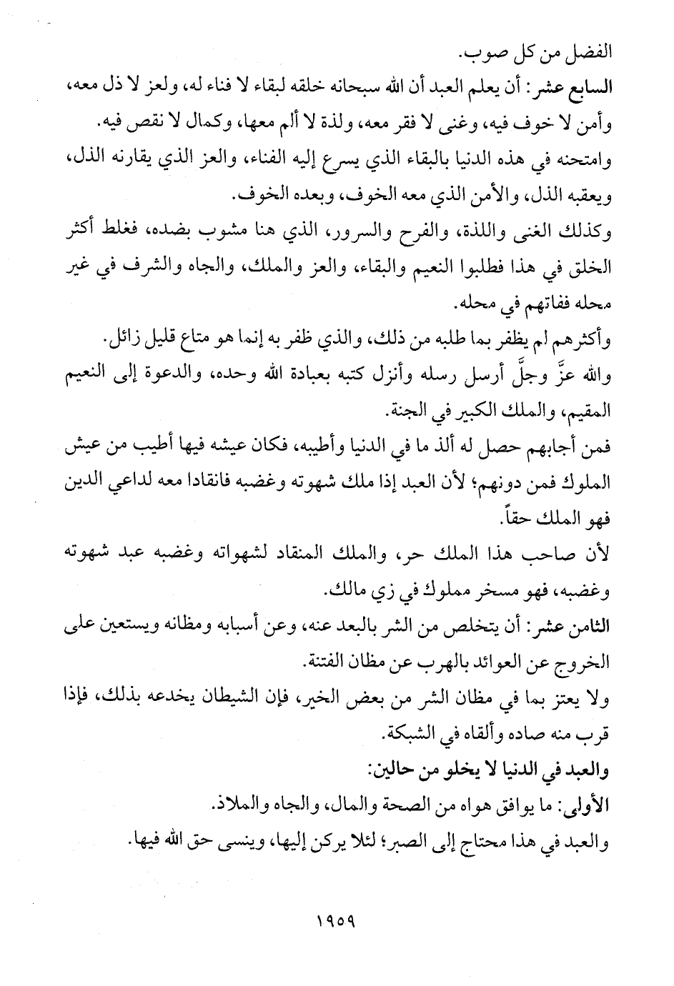 السابع عشر: أن يعلم العبد أن الله سبحانه خلقه لبقاء لا فناء له، ولعز لا ذل معه، وأمن لا خوف فيه، وغنى لا فقر معه، ولذة لا ألم معها، وكمال لا نقص فيه.