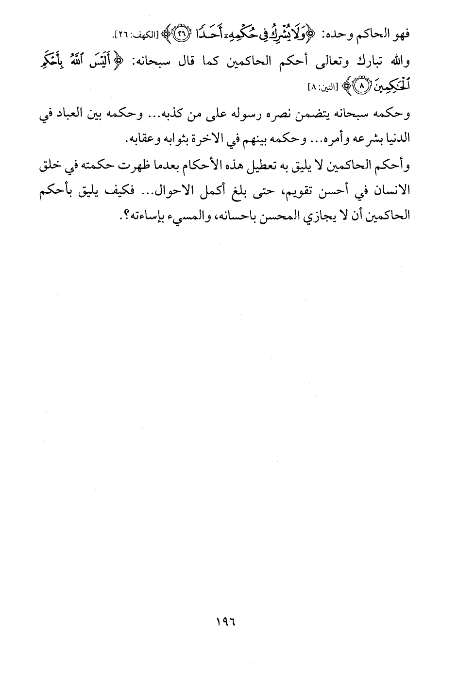وأحكم الحاكمين لا يليق به تعطيل هذه الأحكام بعدما ظهرت حكمته في خلق الانسان في أحسن تقويم، حتى بلغ أكمل الاحوال ... فكيف يليق بأحكم الحاكمين أن لا يجازي المحسن باحسانه، والمسيء بإساءته؟.