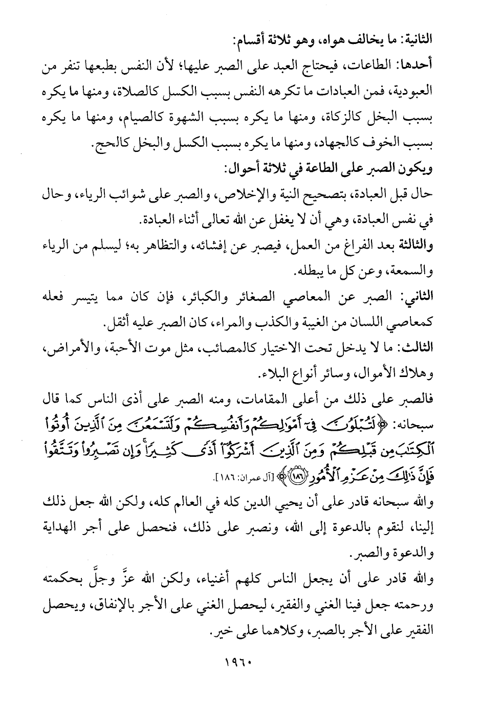 فالصبر على ذلك من أعلى المقامات، ومنه الصبر على أذى الناس كما قال سبحانه: {لَتُبْلَوُنَّ فِي أَمْوَالِكُمْ وَأَنْفُسِكُمْ وَلَتَسْمَعُنَّ مِنَ الَّذِينَ أُوتُوا الْكِتَابَ مِنْ قَبْلِكُمْ وَمِنَ الَّذِينَ أَشْرَكُوا أَذًى كَثِيرًا وَإِنْ تَصْبِرُوا وَتَتَّقُوا فَإِنَّ ذَلِكَ مِنْ عَزْمِ الْأُمُورِ (186)} [آل عمران: 186].