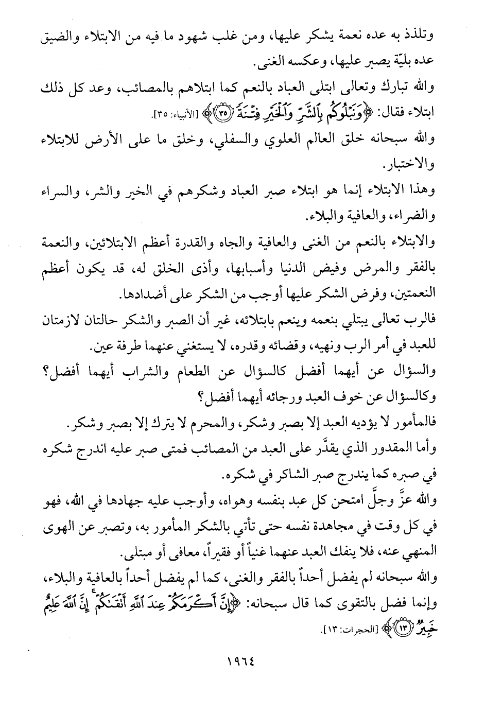 فالرب تعالى يبتلي بنعمه وينعم بابتلائه، غير أن الصبر والشكر حالتان لازمتان للعبد في أمر الرب ونهيه، وقضائه وقدره، لا يستغني عنهما طرفة عين.