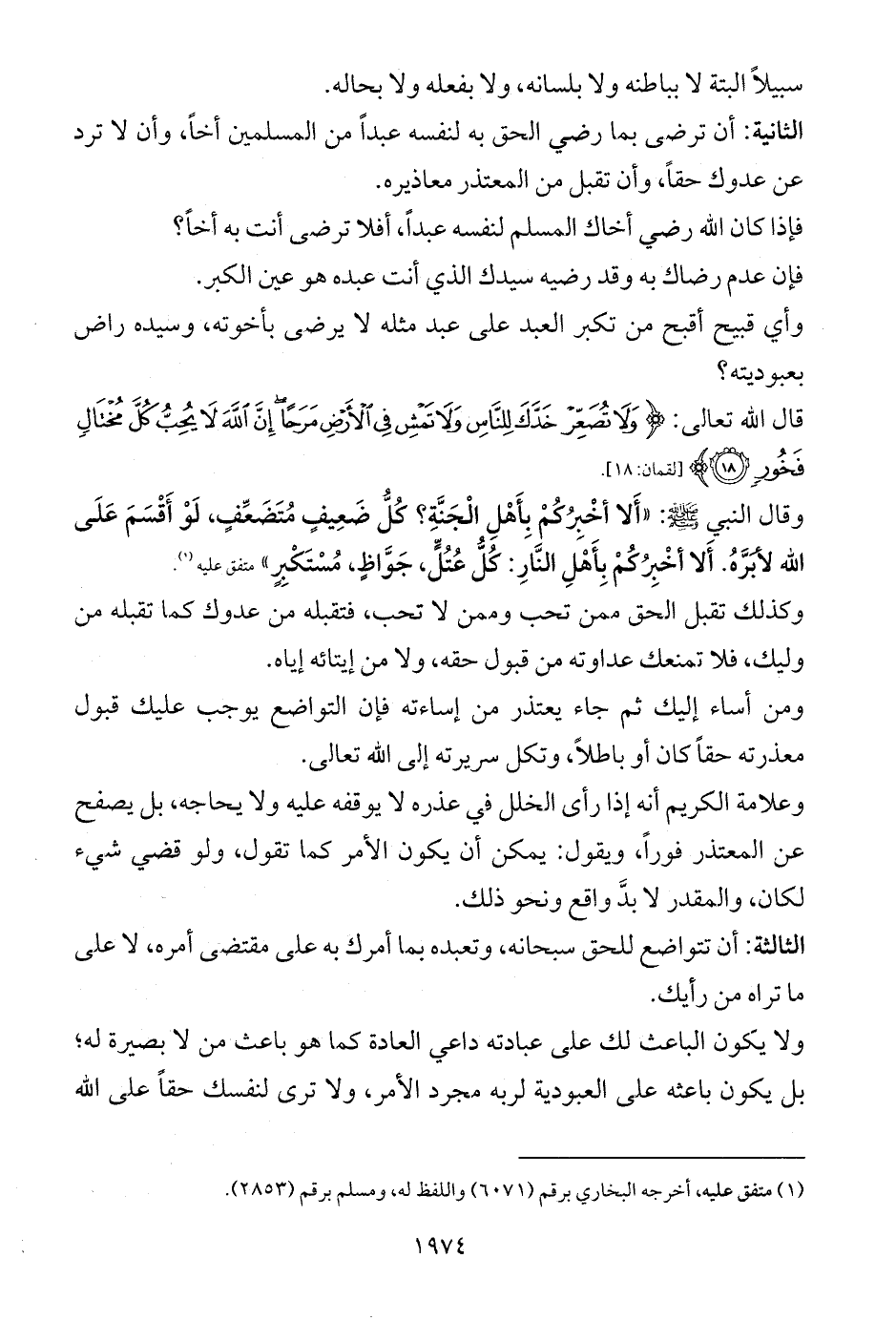 قال الله تعالى: {وَلَا تُصَعِّرْ خَدَّكَ لِلنَّاسِ وَلَا تَمْشِ فِي الْأَرْضِ مَرَحًا إِنَّ اللَّهَ لَا يُحِبُّ كُلَّ مُخْتَالٍ فَخُورٍ (18)} [لقمان: 18].