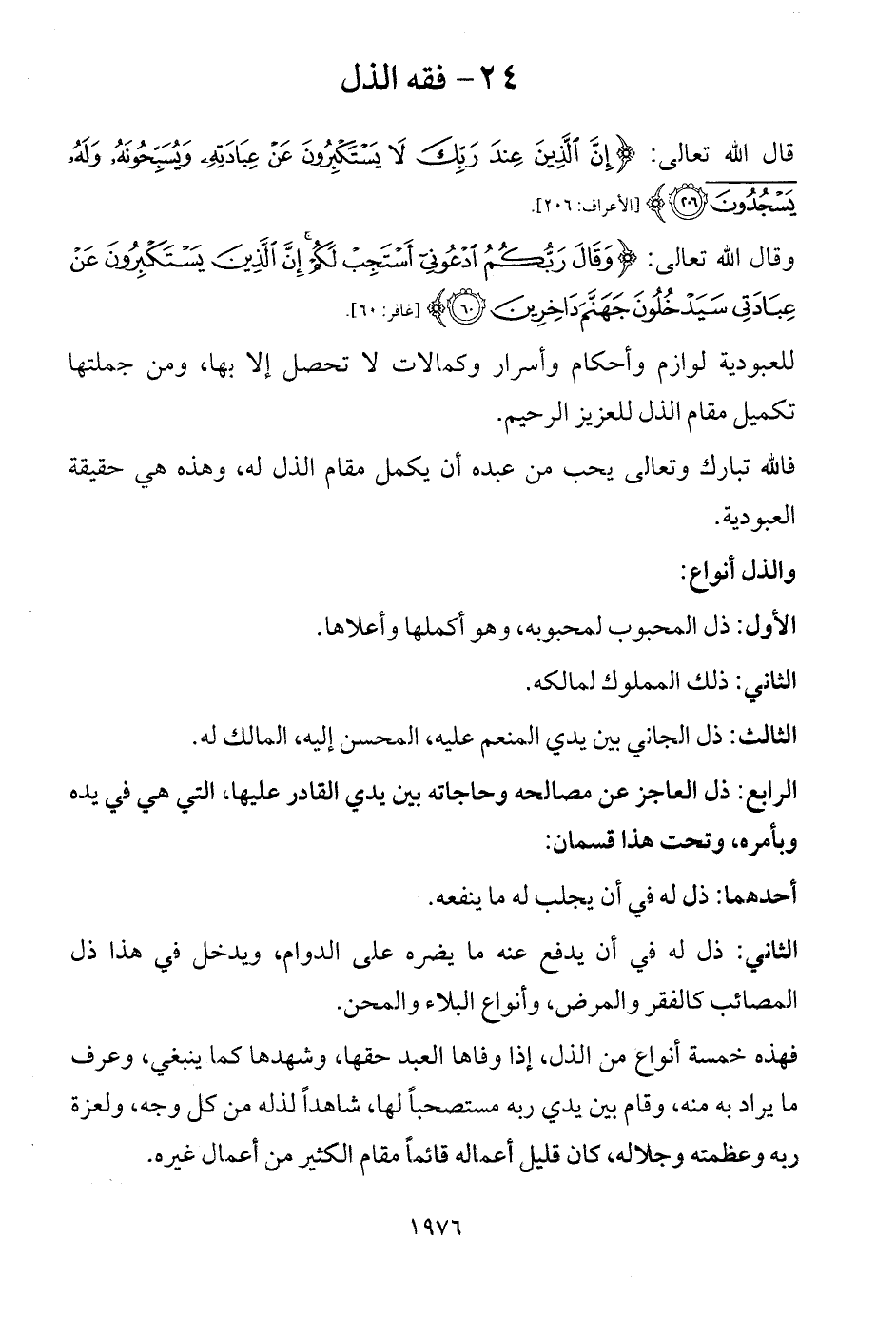 فهذه خمسة أنواع من الذل، إذا وفاها العبد حقها، وشهدها كما ينبغي، وعرف ما يراد به منه، وقام بين يدي ربه مستصحباً لها، شاهداً لذله من كل وجه، ولعزة ربه وعظمته وجلاله، كان قليل أعماله قائماً مقام الكثير من أعمال غيره.