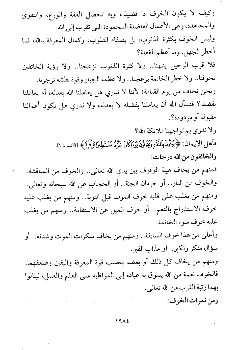 ومنهم من يخاف كل ذلك أو بعضه بحسب قوة المعرفة واليقين وضعفهما. فالخوف نعمة من الله يسوق به عباده إلى المواظبة على العلم والعمل، لينالوا بهما رتبة القرب من الله تعالى.