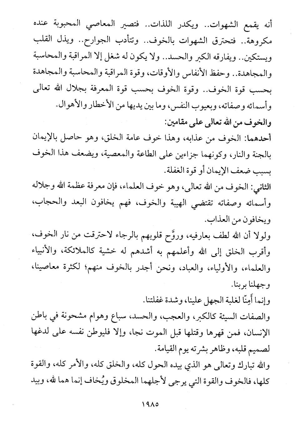 الثاني: الخوف من الله تعالى، وهو خوف العلماء، فإن معرفة عظمة الله وجلاله وأسمائه وصفاته تقتضي الهيبة والخوف، فهم يخافون البعد والحجاب، ويخافون من العذاب.