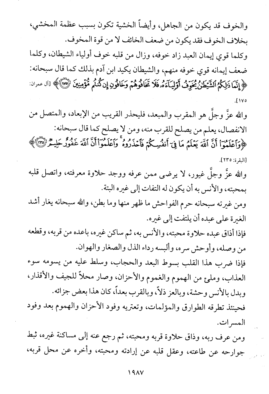 وكلما قوي إيمان العبد زاد خوفه، وزال من قلبه خوف أولياء الشيطان، وكلما ضعف إيمانه قوي خوفه منهم، والشيطان يكيد ابن آدم بذلك كما قال سبحانه: {إِنَّمَا ذَلِكُمُ الشَّيْطَانُ يُخَوِّفُ أَوْلِيَاءَهُ فَلَا تَخَافُوهُمْ وَخَافُونِ إِنْ كُنْتُمْ مُؤْمِنِينَ (175)} [آل عمران: 175].