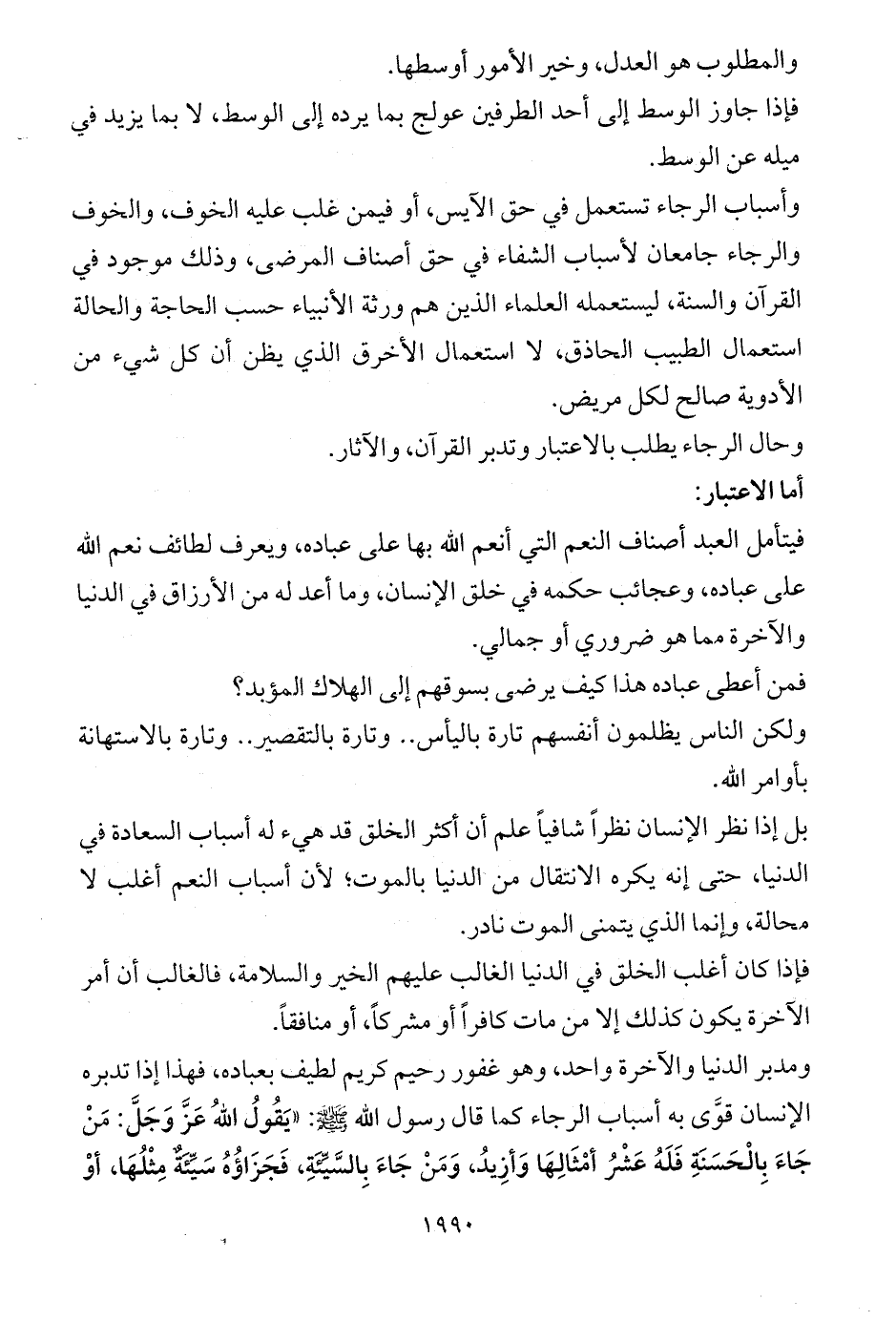 وأسباب الرجاء تستعمل في حق الآيس، أو فيمن غلب عليه الخوف، والخوف والرجاء جامعان لأسباب الشفاء في حق أصناف المرضى، وذلك موجود في القرآن والسنة، ليستعمله العلماء الذين هم ورثة الأنبياء حسب الحاجة والحالة استعمال الطبيب الحاذق، لا استعمال الأخرق الذي يظن أن كل شيء من الأدوية صالح لكل مريض.