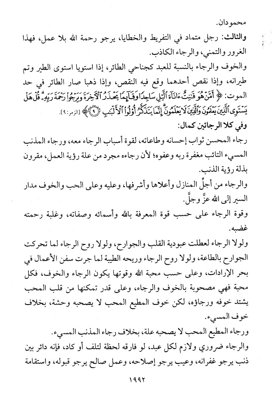 والخوف والرجاء بالنسبة للعبد كجناحي الطائر، إذا استويا استوى الطير وتم طيرانه، وإذا نقص أحدهما وقع فيه النقص، وإذا ذهبا صار الطائر في حد الموت: {أَمَّنْ هُوَ قَانِتٌ آنَاءَ اللَّيْلِ سَاجِدًا وَقَائِمًا يَحْذَرُ الْآخِرَةَ وَيَرْجُو رَحْمَةَ رَبِّهِ قُلْ هَلْ يَسْتَوِي الَّذِينَ يَعْلَمُونَ وَالَّذِينَ لَا يَعْلَمُونَ إِنَّمَا يَتَذَكَّرُ أُولُو الْأَلْبَابِ (9)} [الزمر: 9].
