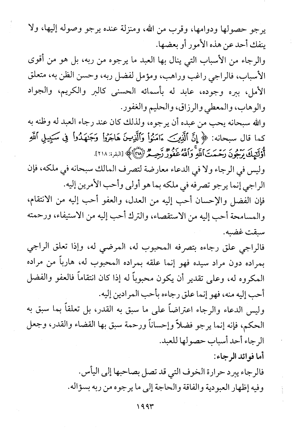 فالراجي علق رجاءه بتصرفه المحبوب له، المرضي له، وإذا تعلق الراجي بمراده دون مراد سيده فهو إنما علقه بمراده المحبوب له، هارباً من مراده المكروه له، وعلى تقدير أن يكون محبوباً له إذا كان انتقاماً فالعفو والفضل أحب إليه منه، فهو إنما علق رجاءه بأحب المرادين إليه.