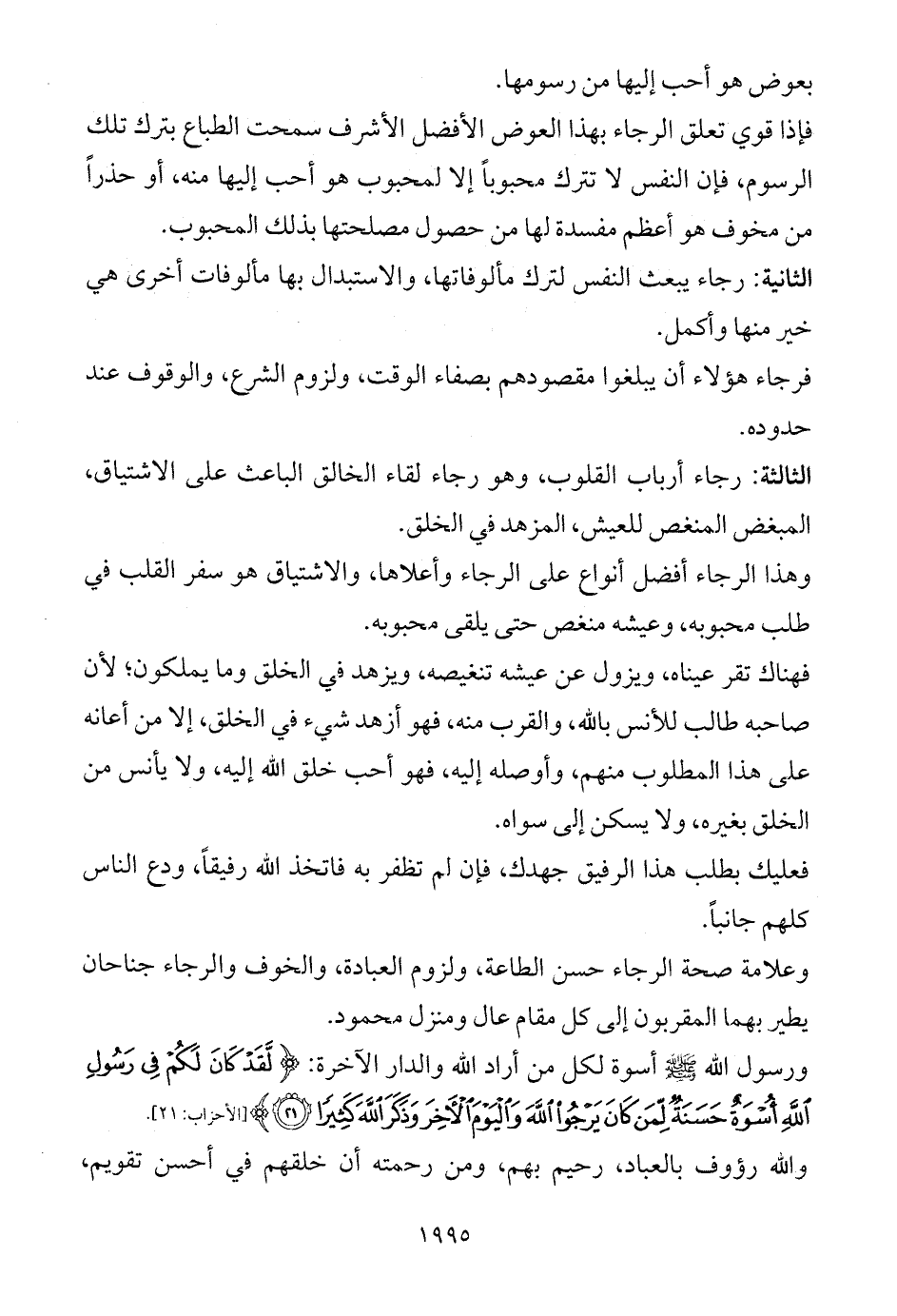 الثانية: رجاء يبعث النفس لترك مألوفاتها، والاستبدال بها مألوفات أخرى هي خير منها وأكمل.