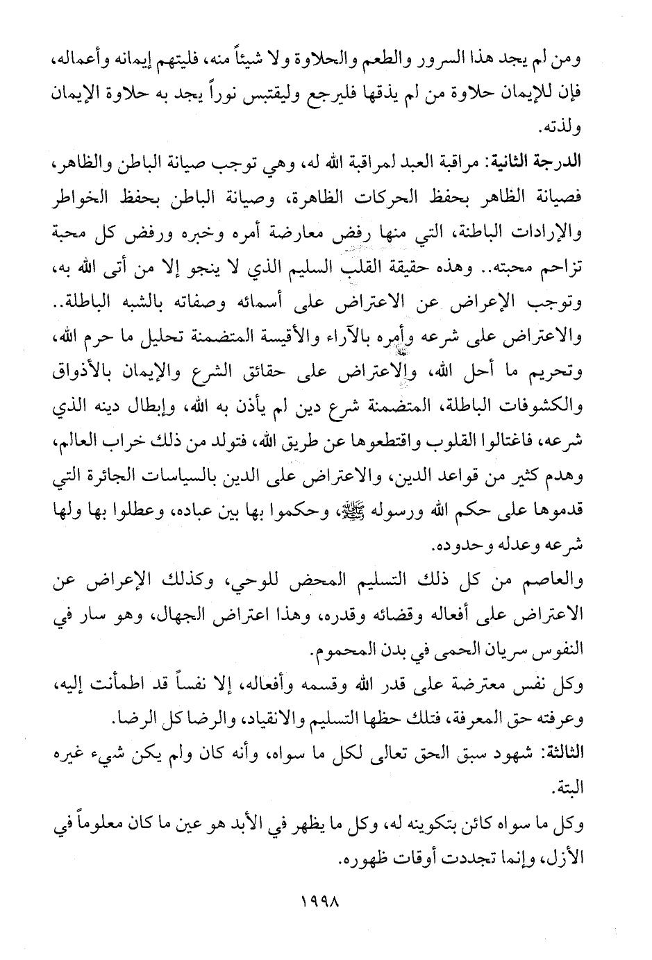 الدرجة الثانية: مراقبة العبد لمراقبة الله له، وهي توجب صيانة الباطن والظاهر، فصيانة الظاهر بحفظ الحركات الظاهرة، وصيانة الباطن بحفظ الخواطر والإرادات الباطنة، التي منها رفض معارضة أمره وخبره ورفض كل محبة تزاحم محبته .. وهذه حقيقة القلب السليم الذي لا ينجو إلا من أتى الله به، وتوجب الإعراض عن الاعتراض على أسمائه وصفاته بالشبه الباطلة .. والاعتراض على شرعه وأمره بالآراء والأقيسة المتضمنة تحليل ما حرم الله، وتحريم ما أحل الله، والاعتراض على حقائق الشرع والإيمان بالأذواق والكشوفات الباطلة، المتضمنة شرع دين لم يأذن به الله، وإبطال دينه الذي شرعه، فاغتالوا القلوب واقتطعوها عن طريق الله، فتولد من ذلك خراب العالم، وهدم كثير من قواعد الدين، والاعتراض على الدين بالسياسات الجائرة التي قدموها على حكم الله ورسوله - صلى الله عليه وسلم -، وحكموا بها بين عباده، وعطلوا بها ولها شرعه وعدله وحدوده.