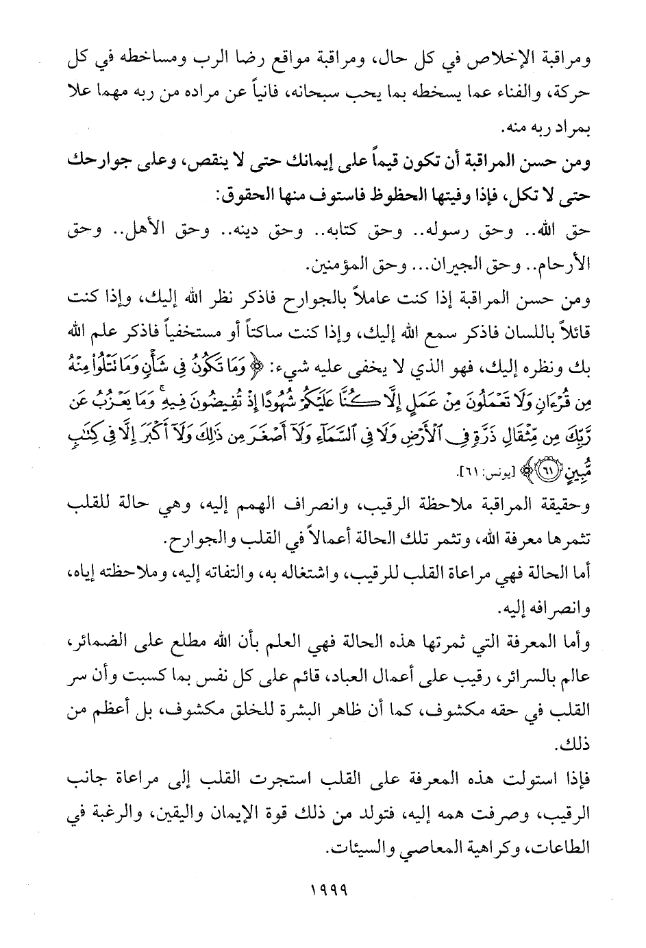 ومن حسن المراقبة إذا كنت عاملاً بالجوارح فاذكر نظر الله إليك، وإذا كنت قائلاً باللسان فاذكر سمع الله إليك، وإذا كنت ساكتاً أو مستخفياً فاذكر علم الله بك ونظره إليك، فهو الذي لا يخفى عليه شيء: {وَمَا تَكُونُ فِي شَأْنٍ وَمَا تَتْلُو مِنْهُ مِنْ قُرْآنٍ وَلَا تَعْمَلُونَ مِنْ عَمَلٍ إِلَّا كُنَّا عَلَيْكُمْ شُهُودًا إِذْ تُفِيضُونَ فِيهِ وَمَا يَعْزُبُ عَنْ رَبِّكَ مِنْ مِثْقَالِ ذَرَّةٍ فِي الْأَرْضِ وَلَا فِي السَّمَاءِ وَلَا أَصْغَرَ مِنْ ذَلِكَ وَلَا أَكْبَرَ إِلَّا فِي كِتَابٍ مُبِينٍ (61)} [يونس: 61].