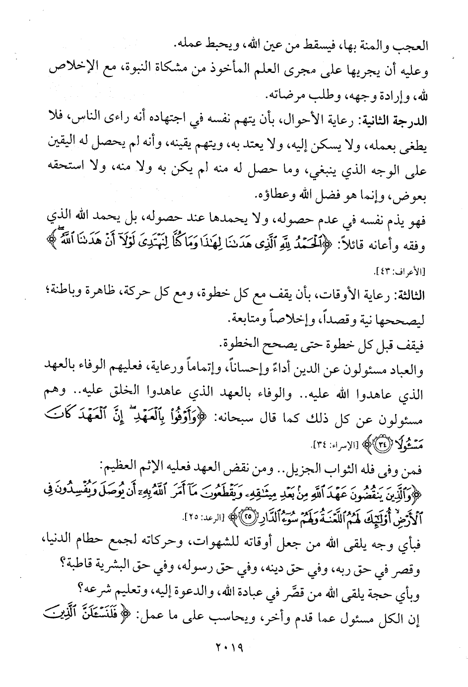 والعباد مسئولون عن الدين أداءً وإحساناً، وإتماماً ورعاية، فعليهم الوفاء بالعهد الذي عاهدوا الله عليه .. والوفاء بالعهد الذي عاهدوا الخلق عليه .. وهم مسئولون عن كل ذلك كما قال سبحانه: {وَأَوْفُوا بِالْعَهْدِ إِنَّ الْعَهْدَ كَانَ مَسْئُولًا (34)} [الإسراء: 34].