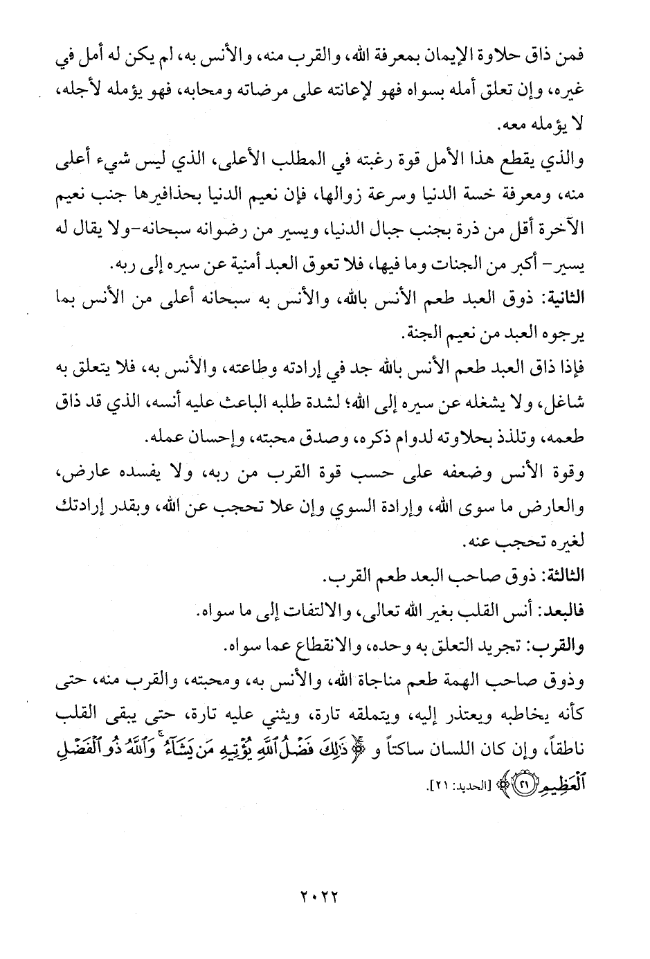 فمن ذاق حلاوة الإيمان بمعرفة الله، والقرب منه، والأنس به، لم يكن له أمل في غيره، وإن تعلق أمله بسواه فهو لإعانته على مرضاته ومحابه، فهو يؤمله لأجله، لا يؤمله معه.