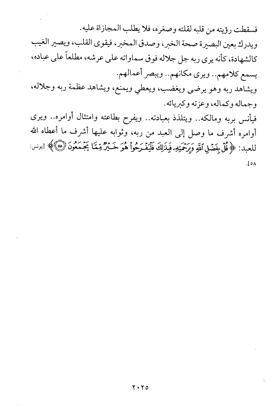 ويدرك بعين البصيرة صحة الخبر، وصدق المخبر، فيقوى القلب، ويصير الغيب كالشهادة، كأنه يرى ربه جل جلاله فوق سماواته على عرشه، مطلعاً على عباده، يسمع كلامهم .. ويرى مكانهم .. ويبصر أعمالهم.