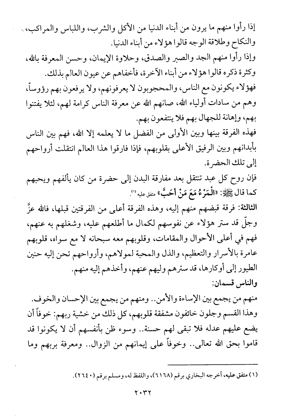 الثالثة: فرقة قبضهم منهم إليه، وهذه الفرقة أعلى من الفرقتين قبلها، فالله عزَّ وجلّ قد ستر هؤلاء عن نفوسهم لكمال ما أطلعهم عليه، وشغلهم به عنهم، فهم في أعلى الأحوال والمقامات، وقلوبهم معه سبحانه لا مع سواه، قلوبهم عامرة بالأسرار والتعظيم، والذل والمحبة لمولاهم، وأرواحهم تحن إليه حنين الطيور إلى أوكارها، قد سترهم وليهم عنهم، وأخذهم إليه منهم.