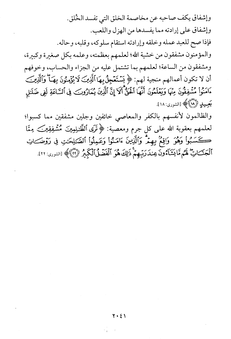 والمؤمنون مشفقون من خشية الله؛ لعلمهم بعظمته، وعلمه بكل صغيرة وكبيرة، ومشفقون من الساعة؛ لعلمهم بما تشتمل عليه من الجزاء والحساب، وخوفهم أن لا تكون أعمالهم منجية لهم: {يَسْتَعْجِلُ بِهَا الَّذِينَ لَا يُؤْمِنُونَ بِهَا وَالَّذِينَ آمَنُوا مُشْفِقُونَ مِنْهَا وَيَعْلَمُونَ أَنَّهَا الْحَقُّ أَلَا إِنَّ الَّذِينَ يُمَارُونَ فِي السَّاعَةِ لَفِي ضَلَالٍ بَعِيدٍ (18)} [الشورى: 18].