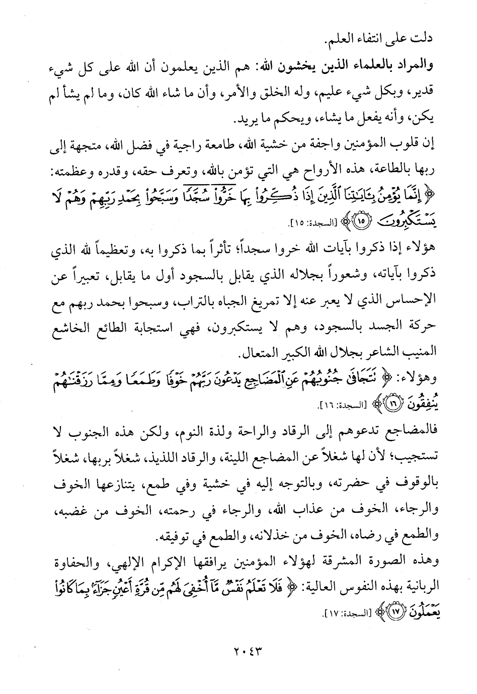 هؤلاء إذا ذكروا بآيات الله خروا سجداً؛ تأثراً بما ذكروا به، وتعظيماً لله الذي ذكروا بآياته، وشعوراً بجلاله الذي يقابل بالسجود أول ما يقابل، تعبيراً عن الإحساس الذي لا يعبر عنه إلا تمريغ الجباه بالتراب، وسبحوا بحمد ربهم مع حركة الجسد بالسجود، وهم لا يستكبرون، فهي استجابة الطائع الخاشع المنيب الشاعر بجلال الله الكبير المتعال.