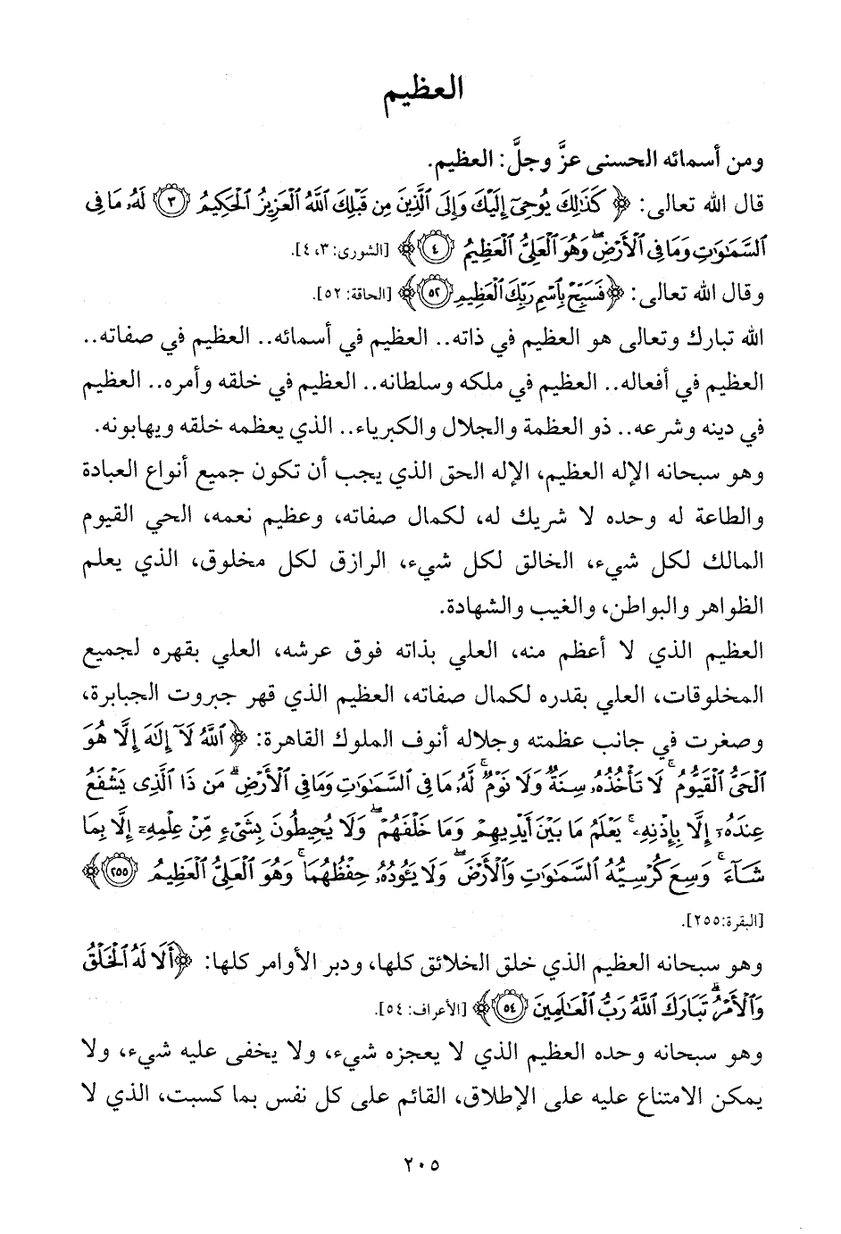 العظيم الذي لا أعظم منه، العلي بذاته فوق عرشه، العلي بقهره لجميع المخلوقات، العلي بقدره لكمال صفاته، العظيم الذي قهر جبروت الجبابرة، وصغرت في جانب عظمته وجلاله أنوف الملوك القاهرة: {اللَّهُ لَا إِلَهَ إِلَّا هُوَ الْحَيُّ الْقَيُّومُ لَا تَأْخُذُهُ سِنَةٌ وَلَا نَوْمٌ لَهُ مَا فِي السَّمَاوَاتِ وَمَا فِي الْأَرْضِ مَنْ ذَا الَّذِي يَشْفَعُ عِنْدَهُ إِلَّا بِإِذْنِهِ يَعْلَمُ مَا بَيْنَ أَيْدِيهِمْ وَمَا خَلْفَهُمْ وَلَا يُحِيطُونَ بِشَيْءٍ مِنْ عِلْمِهِ إِلَّا بِمَا شَاءَ وَسِعَ كُرْسِيُّهُ السَّمَاوَاتِ وَالْأَرْضَ وَلَا يَئُودُهُ حِفْظُهُمَا وَهُوَ الْعَلِيُّ الْعَظِيمُ (255)} [البقرة:255].