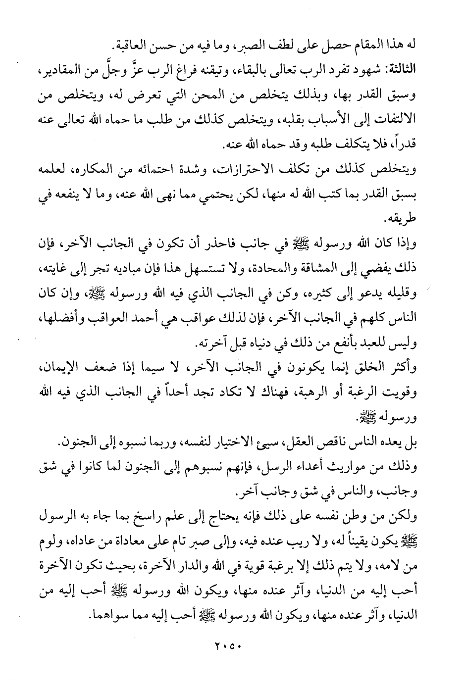 الثالثة: شهود تفرد الرب تعالى بالبقاء، وتيقنه فراغ الرب عزَّ وجلَّ من المقادير، وسبق القدر بها، وبذلك يتخلص من المحن التي تعرض له، ويتخلص من الالتفات إلى الأسباب بقلبه، ويتخلص كذلك من طلب ما حماه الله تعالى عنه قدراً، فلا يتكلف طلبه وقد حماه الله عنه.