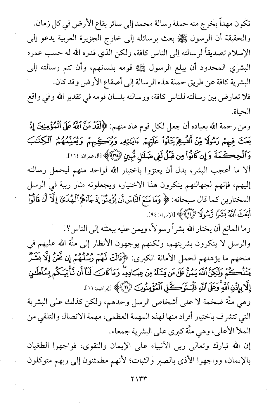 والرسل لا ينكرون بشريتهم، ولكنهم يوجهون الأنظار إلى منَّة الله عليهم في منحهم ما يؤهلهم لحمل الأمانة الكبرى: {قَالَتْ لَهُمْ رُسُلُهُمْ إِنْ نَحْنُ إِلَّا بَشَرٌ مِثْلُكُمْ وَلَكِنَّ اللَّهَ يَمُنُّ عَلَى مَنْ يَشَاءُ مِنْ عِبَادِهِ وَمَا كَانَ لَنَا أَنْ نَأْتِيَكُمْ بِسُلْطَانٍ إِلَّا بِإِذْنِ اللَّهِ وَعَلَى اللَّهِ فَلْيَتَوَكَّلِ الْمُؤْمِنُونَ (11)} [إبراهيم: 11].