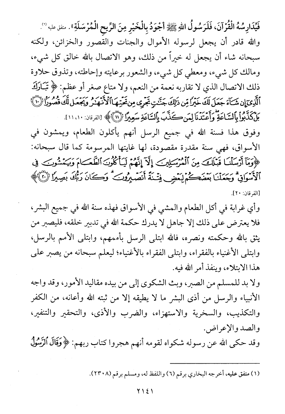 وأي غرابة في أكل الطعام والمشي في الأسواق فهذه سنة الله في جميع البشر، فلا يعترض على ذلك إلا جاهل لا يدرك حكمة الله في تدبير خلقه، فليصبر من يثق بالله وحكمته ونصره، فالله ابتلى الرسل بأممهم، وابتلى الأمم بالرسل، وابتلى الأغنياء بالفقراء، وابتلى الفقراء بالأغنياء؛ ليعلم سبحانه من يصبر على هذا الابتلاء، وينفذ أمر الله فيه.