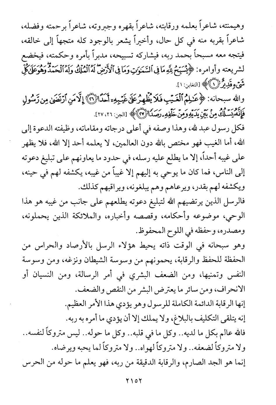 وهيمنته، شاعراً بعلمه ورقابته، شاعراً بقهره وجبروته، شاعراً برحمته وفضله، شاعراً بقربه منه في كل حال، وأخيراً يشعر بالوجود كله متجهاً إلى خالقه، فيتجه معه مسبحاً بحمد ربه، فيشاركه تسبيحه، مدبراً بأمره وحكمته، فيخضع لشريعته وأوامره: {يُسَبِّحُ لِلَّهِ مَا فِي السَّمَاوَاتِ وَمَا فِي الْأَرْضِ لَهُ الْمُلْكُ وَلَهُ الْحَمْدُ وَهُوَ عَلَى كُلِّ شَيْءٍ قَدِيرٌ (1)} [التغابن: 1].