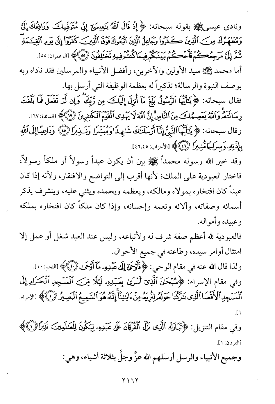 وقد خير الله رسوله محمداً - صلى الله عليه وسلم - بين أن يكون عبداً رسولاً أو ملكاً رسولاً، فاختار العبودية على الملك؛ لأنها أقرب إلى التواضع والافتقار، ولأنه إذا كان عبداً كان افتخاره بمولاه ومالكه، ويعظمه ويحمده ويثني عليه، ويتشرف بذكر أسمائه وصفاته، وآلائه ونعمه وإحسانه، وإذا كان ملكاً كان افتخاره بملكه وعبيده وأمواله.