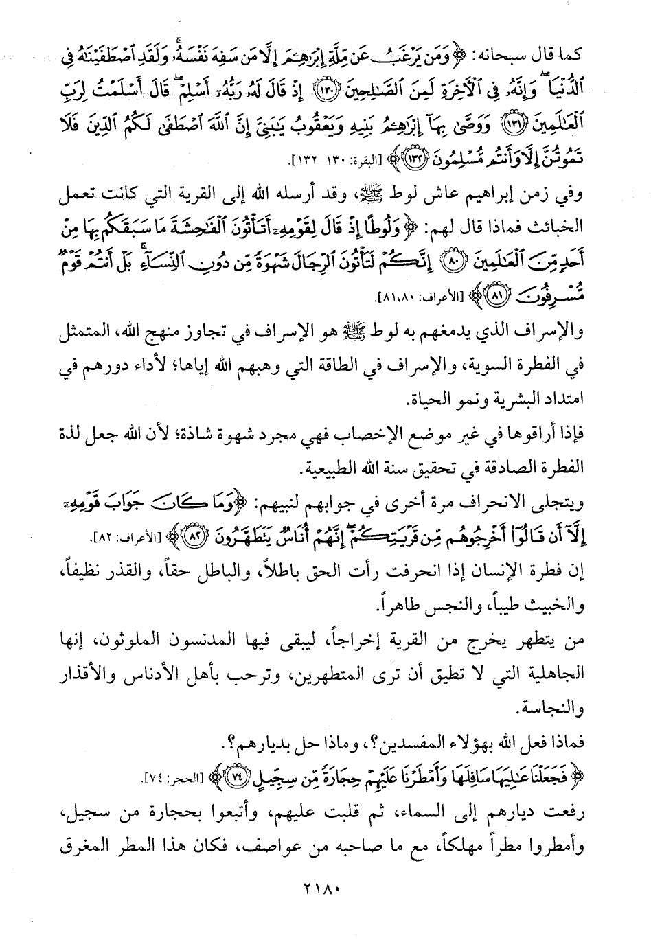 وفي زمن إبراهيم عاش لوط - صلى الله عليه وسلم -، وقد أرسله الله إلى القرية التي كانت تعمل الخبائث فماذا قال لهم: {وَلُوطًا إِذْ قَالَ لِقَوْمِهِ أَتَأْتُونَ الْفَاحِشَةَ مَا سَبَقَكُمْ بِهَا مِنْ أَحَدٍ مِنَ الْعَالَمِينَ (80) إِنَّكُمْ لَتَأْتُونَ الرِّجَالَ شَهْوَةً مِنْ دُونِ النِّسَاءِ بَلْ أَنْتُمْ قَوْمٌ مُسْرِفُونَ (81)} [الأعراف: 80،81].