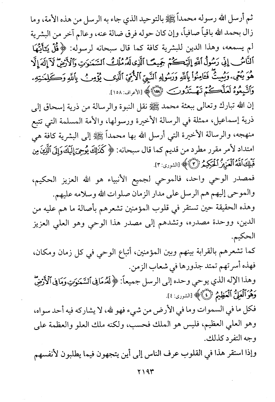 ثم أرسل الله رسوله محمداً - صلى الله عليه وسلم - بالتوحيد الذي جاء به الرسل من هذه الأمة، وما زال بحمد الله باقياً صافياً، وإن كان حوله فرق ضالة عنه، وعالم آخر من البشرية لم يسمعه، وهذا الدين للبشرية كافة كما قال سبحانه لرسوله: {قُلْ يَاأَيُّهَا النَّاسُ إِنِّي رَسُولُ اللَّهِ إِلَيْكُمْ جَمِيعًا الَّذِي لَهُ مُلْكُ السَّمَاوَاتِ وَالْأَرْضِ لَا إِلَهَ إِلَّا هُوَ يُحْيِي وَيُمِيتُ فَآمِنُوا بِاللَّهِ وَرَسُولِهِ النَّبِيِّ الْأُمِّيِّ الَّذِي يُؤْمِنُ بِاللَّهِ وَكَلِمَاتِهِ وَاتَّبِعُوهُ لَعَلَّكُمْ تَهْتَدُونَ (158)} [الأعراف: 158].