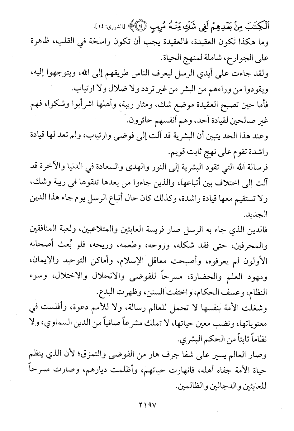 وعند هذا الحد يتبين أن البشرية قد آلت إلى فوضى وارتياب، ولم تعد لها قيادة راشدة تقوم على نهج ثابت قويم.