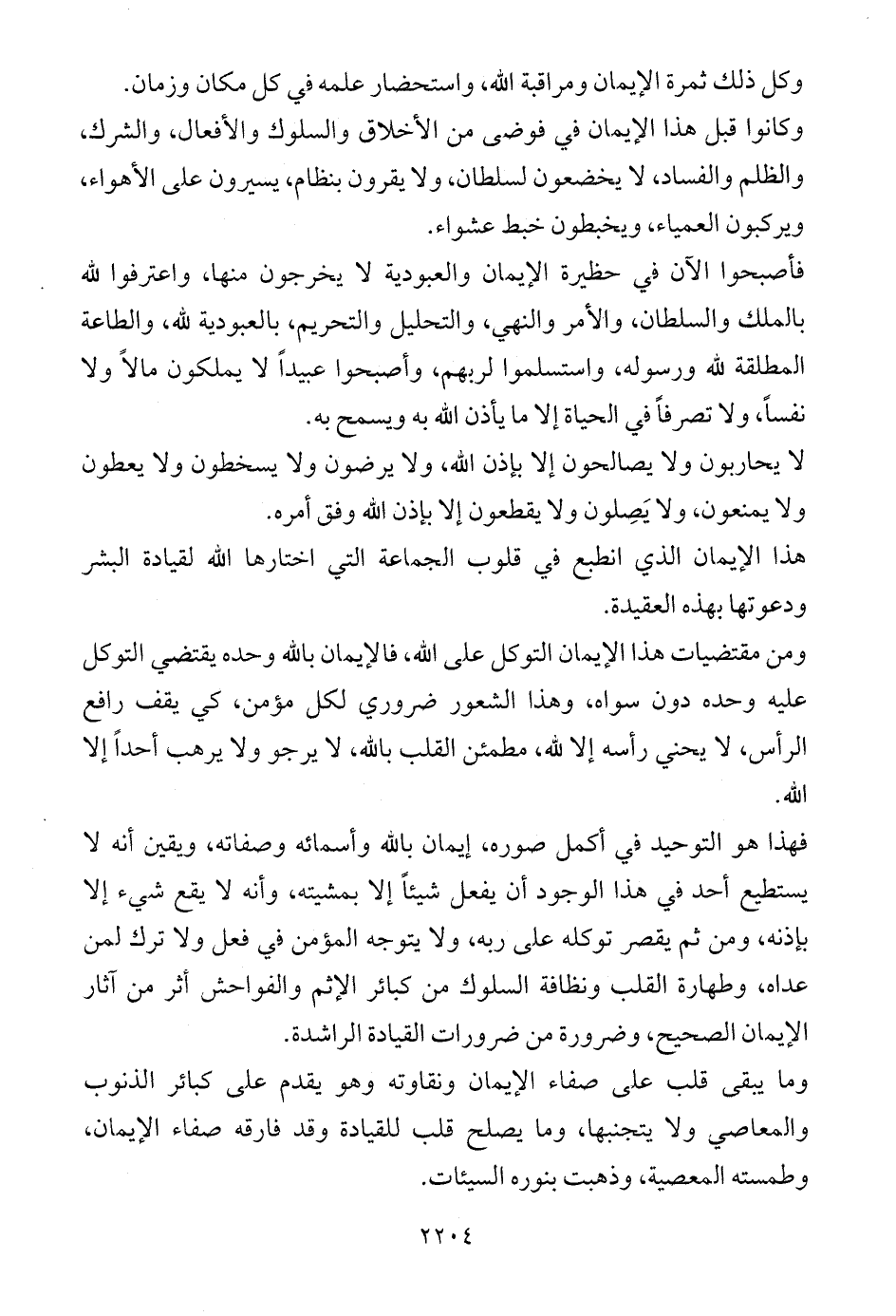 فهذا هو التوحيد في أكمل صوره، إيمان بالله وأسمائه وصفاته، ويقين أنه لا يستطيع أحد في هذا الوجود أن يفعل شيئاً إلا بمشيته، وأنه لا يقع شيء إلا بإذنه، ومن ثم يقصر توكله على ربه، ولا يتوجه المؤمن في فعل ولا ترك لمن عداه، وطهارة القلب ونظافة السلوك من كبائر الإثم والفواحش أثر من آثار الإيمان الصحيح، وضرورة من ضرورات القيادة الراشدة.
