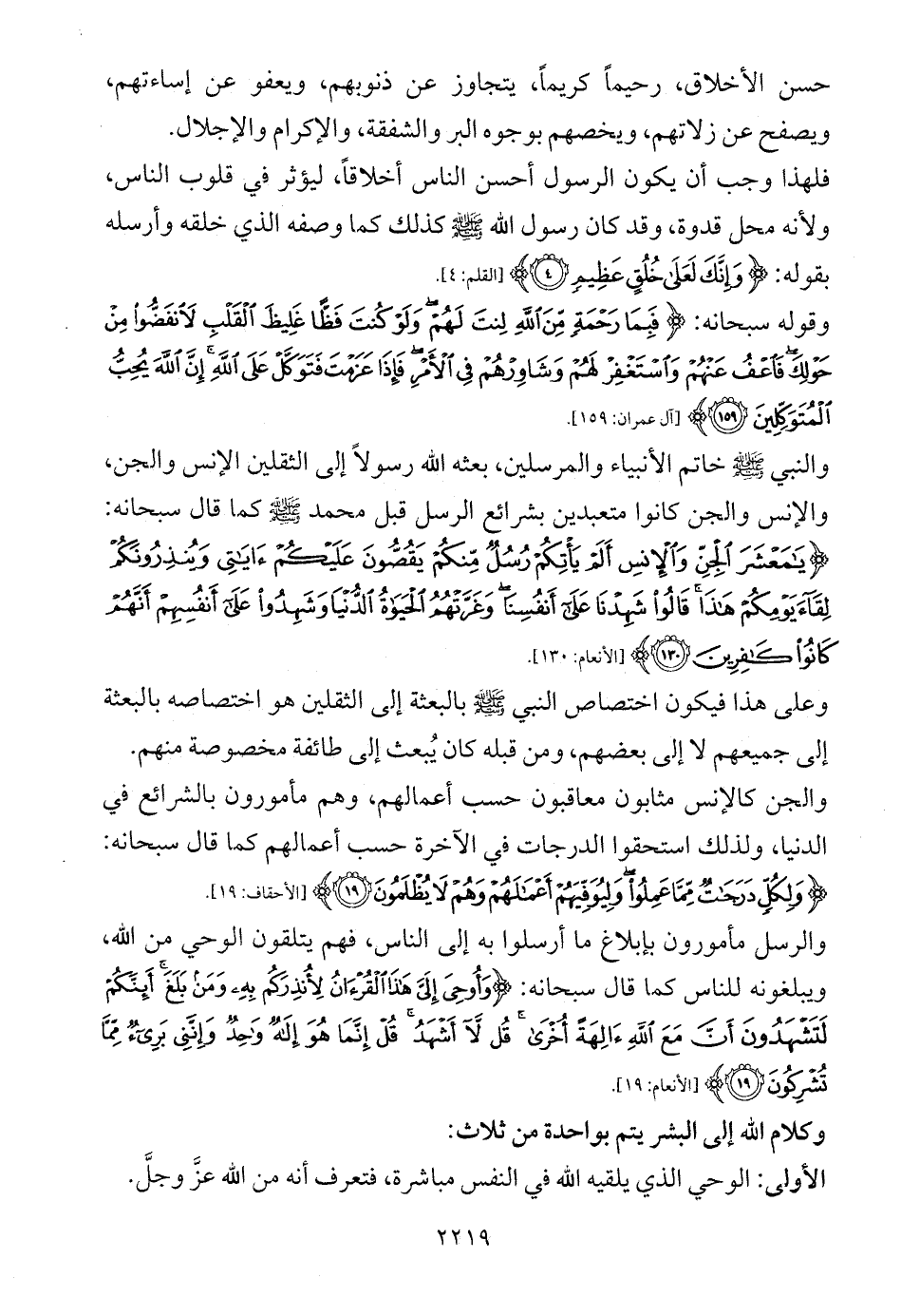 فلهذا وجب أن يكون الرسول أحسن الناس أخلاقاً، ليؤثر في قلوب الناس، ولأنه محل قدوة، وقد كان رسول الله - صلى الله عليه وسلم - كذلك كما وصفه الذي خلقه وأرسله بقوله: {وَإِنَّكَ لَعَلَى خُلُقٍ عَظِيمٍ (4)} [القلم: 4].