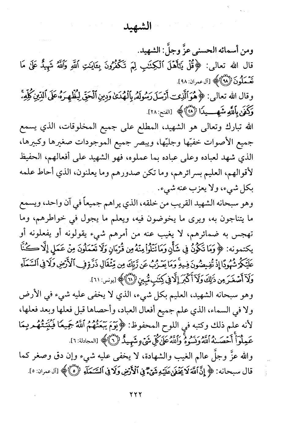 الله تبارك وتعالى هو الشهيد، المطلع على جميع المخلوقات، الذي يسمع جميع الأصوات خفيّها وجليّها، ويبصر جميع الموجودات صغيرها وكبيرها، الذي شهد لعباده وعلى عباده بما عملوه، فهو الشهيد على أفعالهم، الحفيظ لأقوالهم، العليم بسرائرهم، وما تكن صدورهم وما يعلنون، الذي أحاط علمه بكل شيء، ولا يعزب عنه شيء.