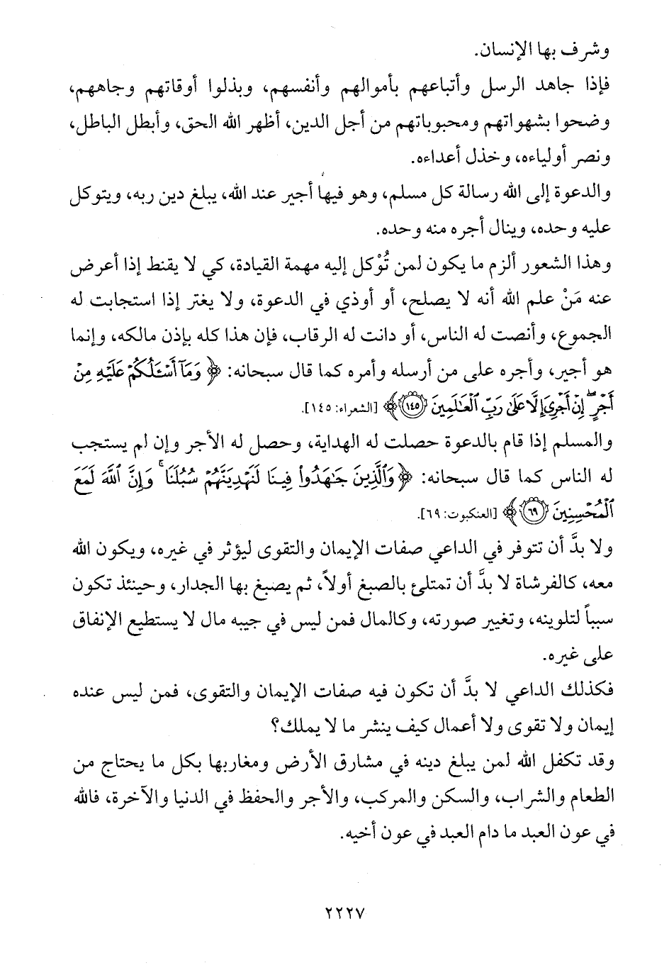 ولا بدَّ أن تتوفر في الداعي صفات الإيمان والتقوى ليؤثر في غيره، ويكون الله معه، كالفرشاة لا بدَّ أن تمتلئ بالصبغ أولاً، ثم يصبغ بها الجدار، وحينئذ تكون سبباً لتلوينه، وتغيير صورته، وكالمال فمن ليس في جيبه مال لا يستطيع الإنفاق على غيره.
