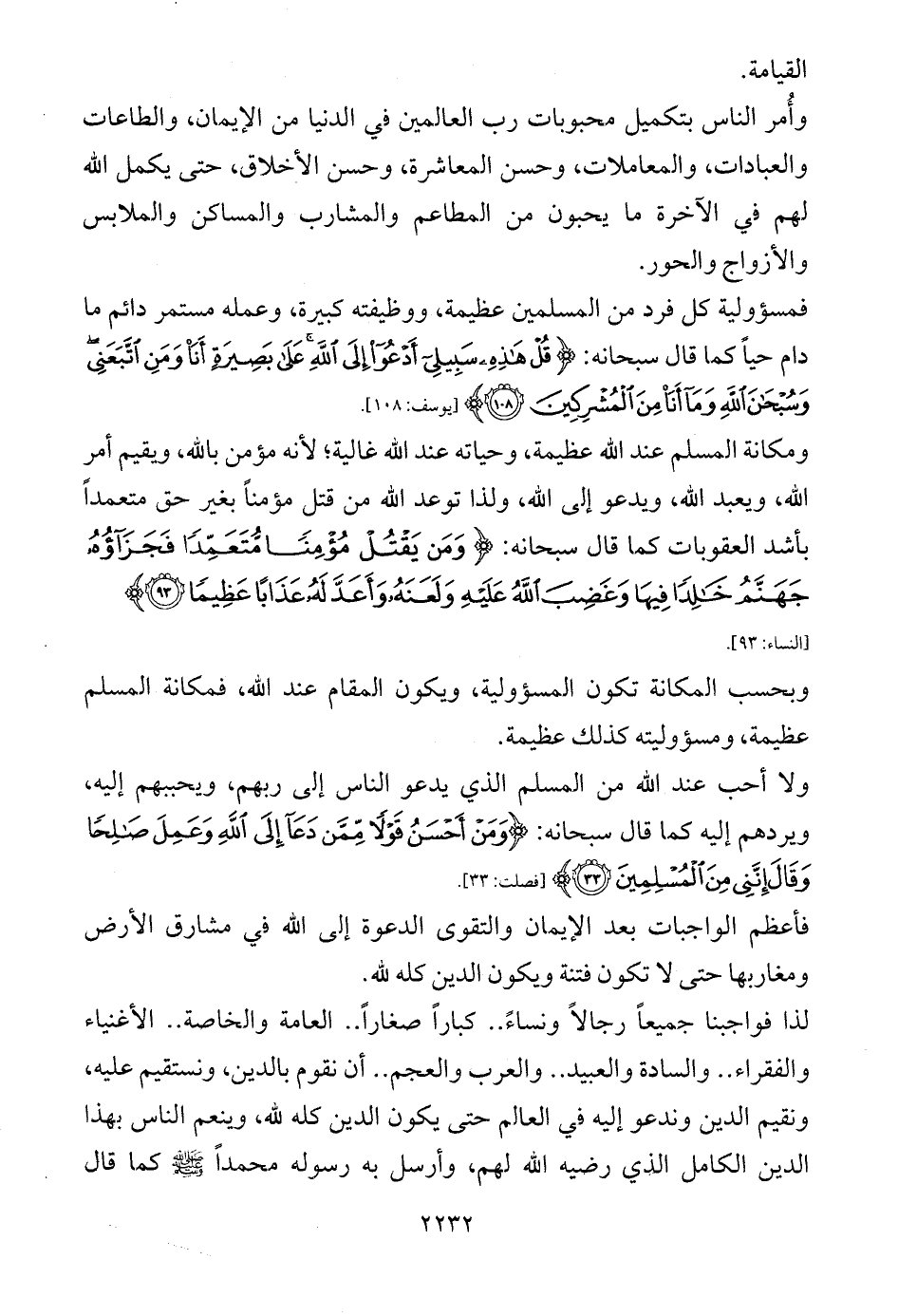 فمسؤولية كل فرد من المسلمين عظيمة، ووظيفته كبيرة، وعمله مستمر دائم ما دام حياً كما قال سبحانه: {قُلْ هَذِهِ سَبِيلِي أَدْعُو إِلَى اللَّهِ عَلَى بَصِيرَةٍ أَنَا وَمَنِ اتَّبَعَنِي وَسُبْحَانَ اللَّهِ وَمَا أَنَا مِنَ الْمُشْرِكِينَ (108)} [يوسف: 108].