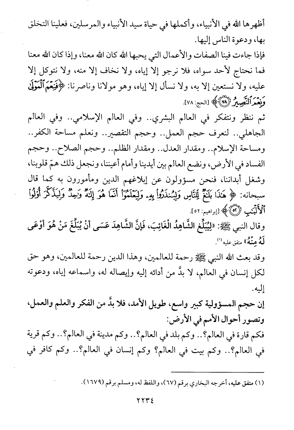 ثم ننظر ونتفكر في العالم البشري .. وفي العالم الإسلامي .. وفي العالم الجاهلي .. لنعرف حجم العمل .. وحجم التقصير .. ونعلم مساحة الكفر .. ومساحة الإسلام .. ومقدار العدل .. ومقدار الظلم .. وحجم الصلاح .. وحجم الفساد في الأرض، ونضع العالم بين أيدينا وأمام أعيننا، ونجعل ذلك همّ قلوبنا، وشغل أبداننا، فنحن مسؤولون عن إبلاغهم الدين ومأمورون به كما قال سبحانه: {هَذَا بَلَاغٌ لِلنَّاسِ وَلِيُنْذَرُوا بِهِ وَلِيَعْلَمُوا أَنَّمَا هُوَ إِلَهٌ وَاحِدٌ وَلِيَذَّكَّرَ أُولُو الْأَلْبَابِ (52)} [إبراهيم: 52].