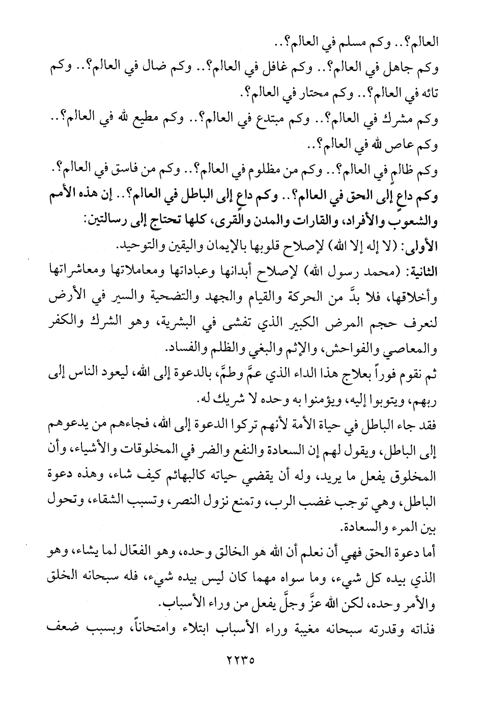 الثانية: (محمد رسول الله) لإصلاح أبدانها وعباداتها ومعاملاتها ومعاشراتها وأخلاقها، فلا بدَّ من الحركة والقيام والجهد والتضحية والسير في الأرض لنعرف حجم المرض الكبير الذي تفشى في البشرية، وهو الشرك والكفر والمعاصي والفواحش، والإثم والبغي والظلم والفساد.