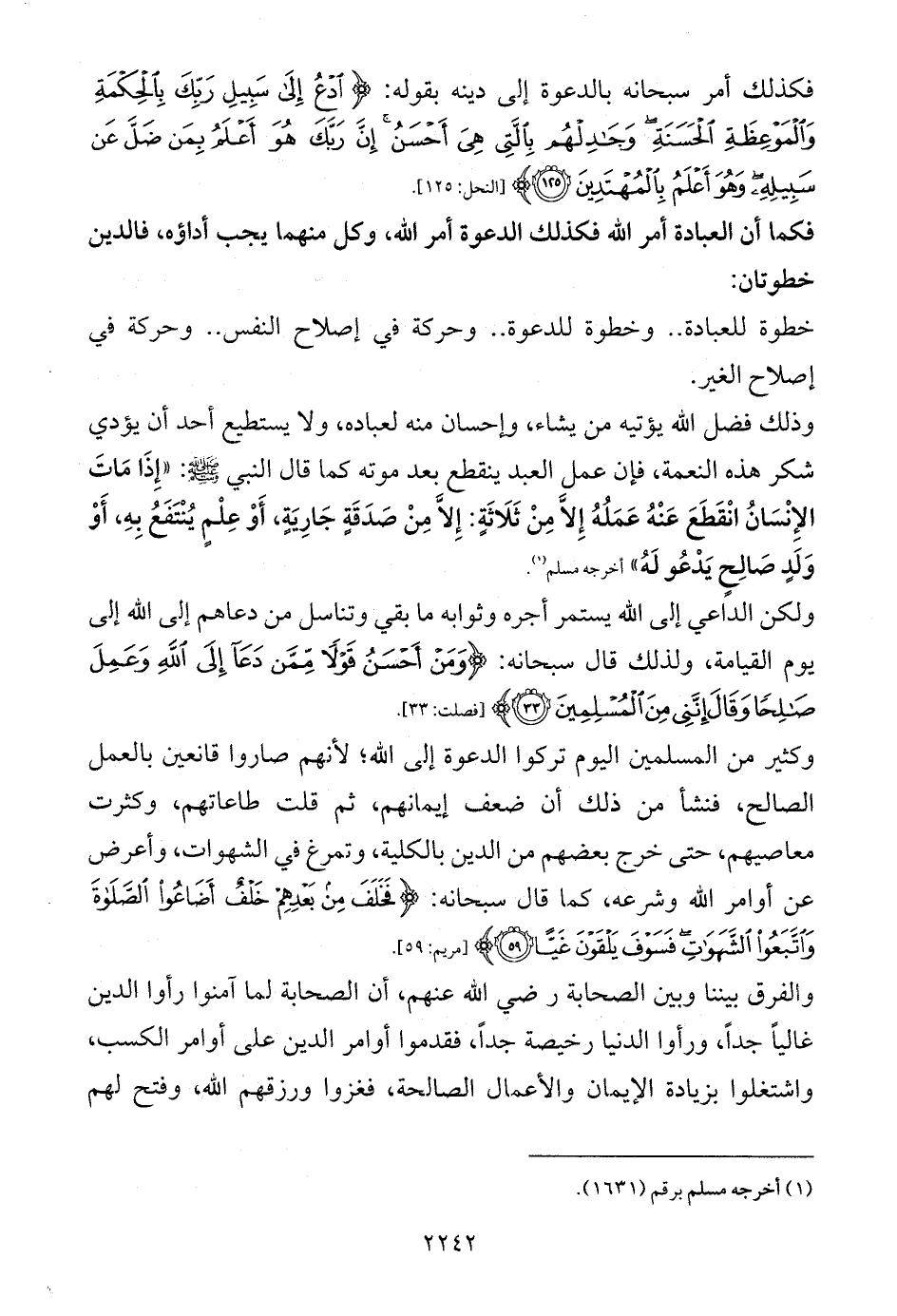 وكثير من المسلمين اليوم تركوا الدعوة إلى الله؛ لأنهم صاروا قانعين بالعمل الصالح، فنشأ من ذلك أن ضعف إيمانهم، ثم قلت طاعاتهم، وكثرت معاصيهم، حتى خرج بعضهم من الدين بالكلية، وتمرغ في الشهوات، وأعرض عن أوامر الله وشرعه، كما قال سبحانه: {فَخَلَفَ مِنْ بَعْدِهِمْ خَلْفٌ أَضَاعُوا الصَّلَاةَ وَاتَّبَعُوا الشَّهَوَاتِ فَسَوْفَ يَلْقَوْنَ غَيًّا (59)} [مريم: 59].
