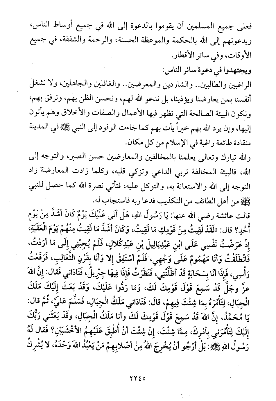 فعلى جميع المسلمين أن يقوموا بالدعوة إلى الله في جميع أوساط الناس، ويدعونهم إلى الله بالحكمة والموعظة الحسنة، والرحمة والشفقة، في جميع الأوقات، وفي سائر الأقطار.