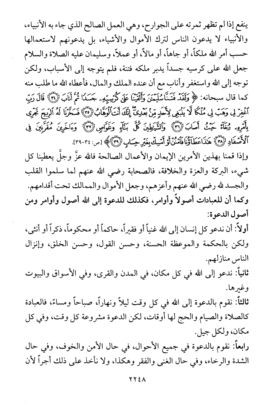 ينفع إذا لم تظهر ثمرته على الجوارح، وهي العمل الصالح الذي جاء به الأنبياء، والأنبياء لا يدعون الناس لترك الأموال والأشياء، بل يدعونهم لاستعمالها حسب أمر الله ملكاً، أو جاهاً، أو مالاً، أو عملاً، وسليمان عليه الصلاة والسلام جعل الله على كرسيه جسداً يدبر ملكه فتنة، فلم يتوجه إلى الأسباب، ولكن توجه إلى الله واستغفر وأناب مع أن عنده الملك والمال، فأعطاه الله ما طلب منه كما قال سبحانه: {وَلَقَدْ فَتَنَّا سُلَيْمَانَ وَأَلْقَيْنَا عَلَى كُرْسِيِّهِ جَسَدًا ثُمَّ أَنَابَ (34) قَالَ رَبِّ اغْفِرْ لِي وَهَبْ لِي مُلْكًا لَا يَنْبَغِي لِأَحَدٍ مِنْ بَعْدِي إِنَّكَ أَنْتَ الْوَهَّابُ (35) فَسَخَّرْنَا لَهُ الرِّيحَ تَجْرِي بِأَمْرِهِ رُخَاءً حَيْثُ أَصَابَ (36) وَالشَّيَاطِينَ كُلَّ بَنَّاءٍ وَغَوَّاصٍ (37) وَآخَرِينَ مُقَرَّنِينَ فِي الْأَصْفَادِ (38) هَذَا عَطَاؤُنَا فَامْنُنْ أَوْ أَمْسِكْ بِغَيْرِ حِسَابٍ (39)} [ص: 34 - 39].