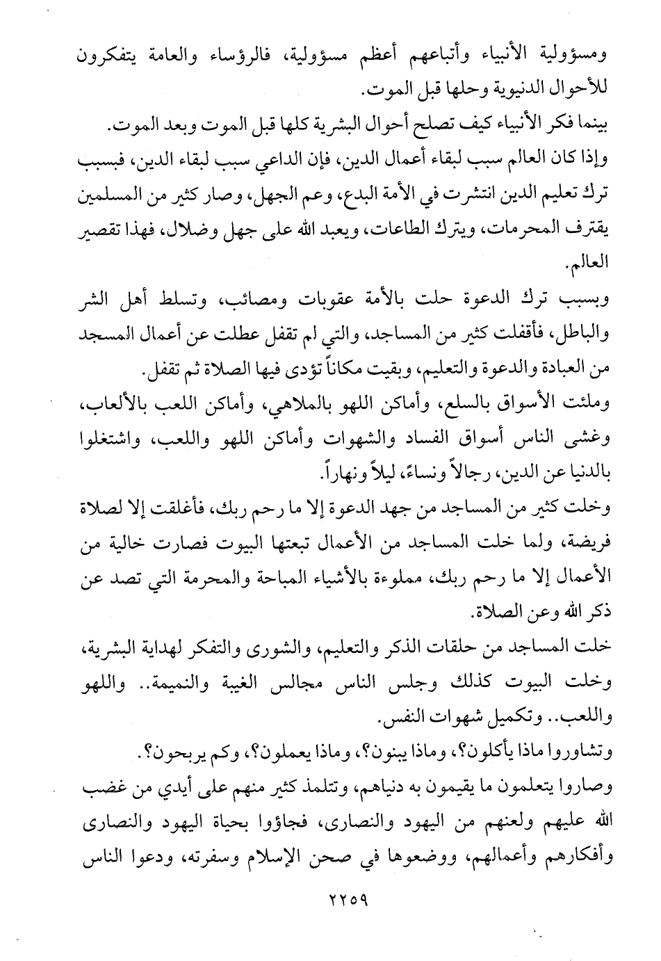 خلت المساجد من حلقات الذكر والتعليم، والشورى والتفكر لهداية البشرية، وخلت البيوت كذلك وجلس الناس مجالس الغيبة والنميمة .. واللهو واللعب .. وتكميل شهوات النفس.