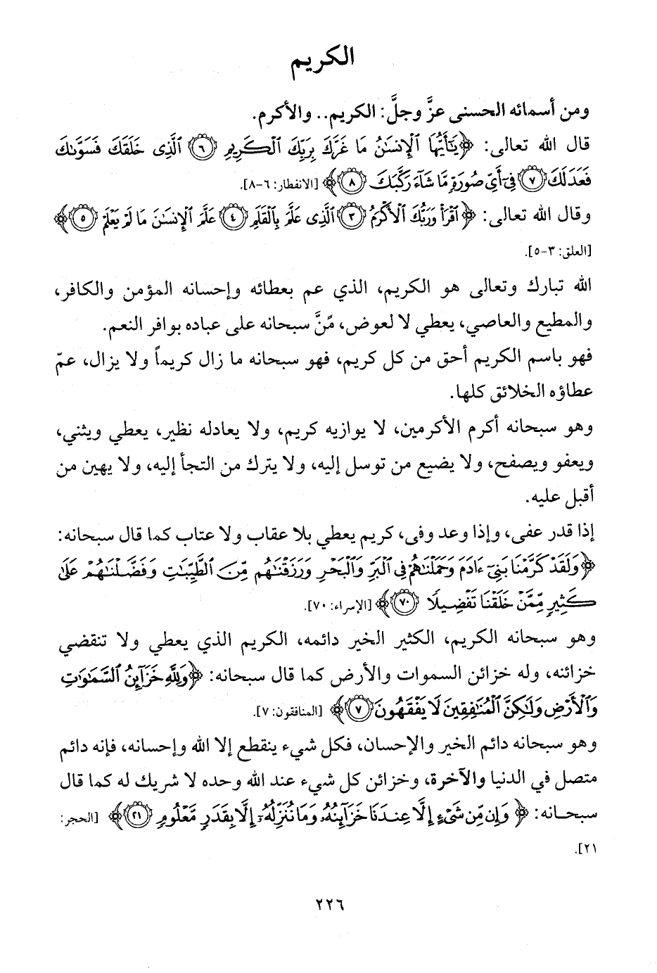 إذا قدر عفى، وإذا وعد وفى، كريم يعطي بلا عقاب ولا عتاب كما قال سبحانه: {وَلَقَدْ كَرَّمْنَا بَنِي آدَمَ وَحَمَلْنَاهُمْ فِي الْبَرِّ وَالْبَحْرِ وَرَزَقْنَاهُمْ مِنَ الطَّيِّبَاتِ وَفَضَّلْنَاهُمْ عَلَى كَثِيرٍ مِمَّنْ خَلَقْنَا تَفْضِيلًا (70)} [الإسراء: 70].