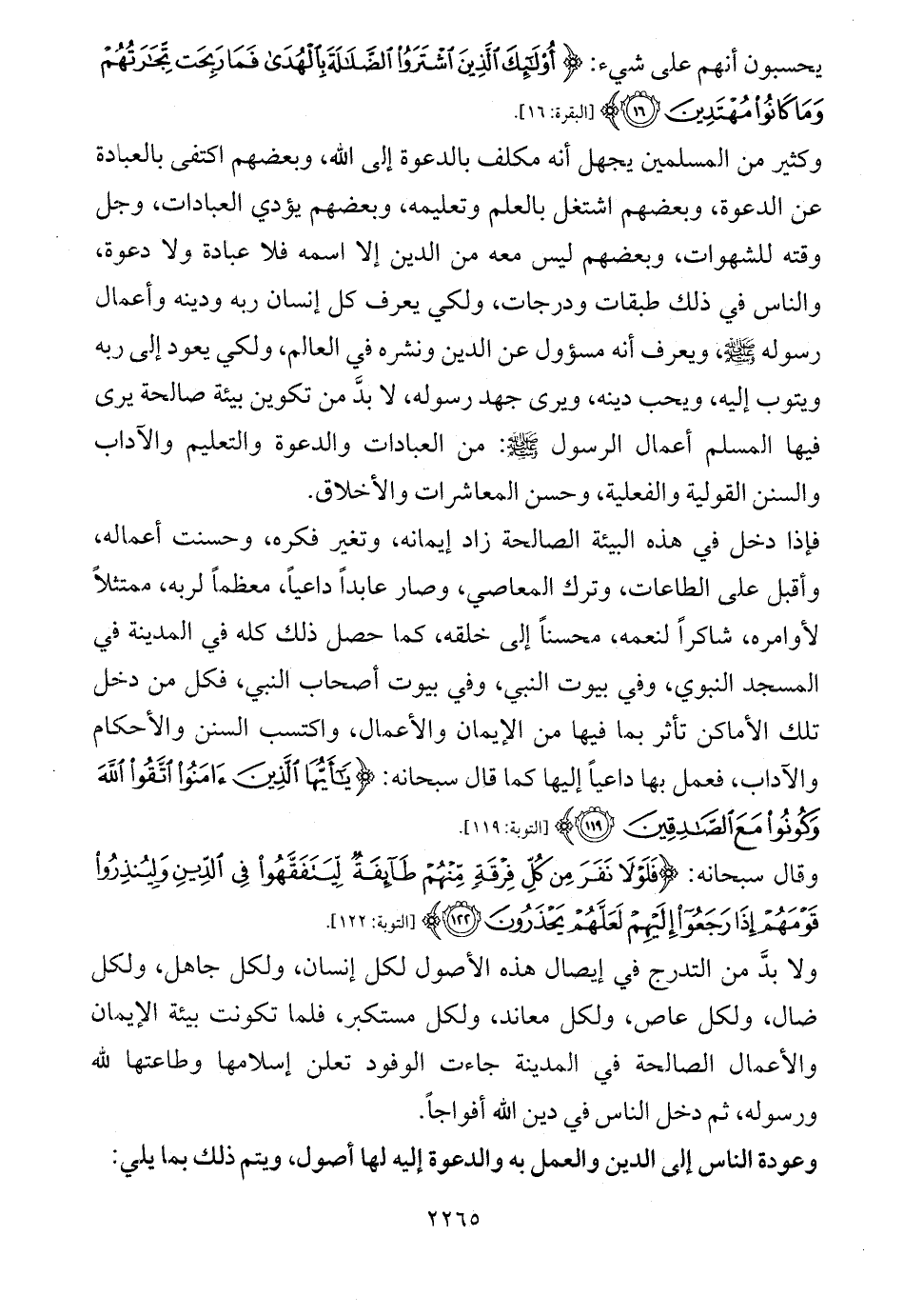 ولا بدَّ من التدرج في إيصال هذه الأصول لكل إنسان، ولكل جاهل، ولكل ضال، ولكل عاص، ولكل معاند، ولكل مستكبر، فلما تكونت بيئة الإيمان والأعمال الصالحة في المدينة جاءت الوفود تعلن إسلامها وطاعتها لله ورسوله، ثم دخل الناس في دين الله أفواجاً.