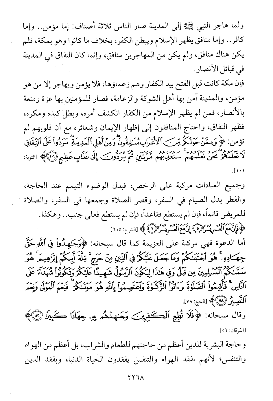 ولما هاجر النبي - صلى الله عليه وسلم - إلى المدينة صار الناس ثلاثة أصناف: إما مؤمن .. وإما كافر .. وإما منافق يظهر الإسلام ويبطن الكفر، بخلاف ما كانوا وهو بمكة، فلم يكن هناك منافق، ولم يكن من المهاجرين منافق، وإنما كان النفاق في المدينة في قبائل الأنصار.