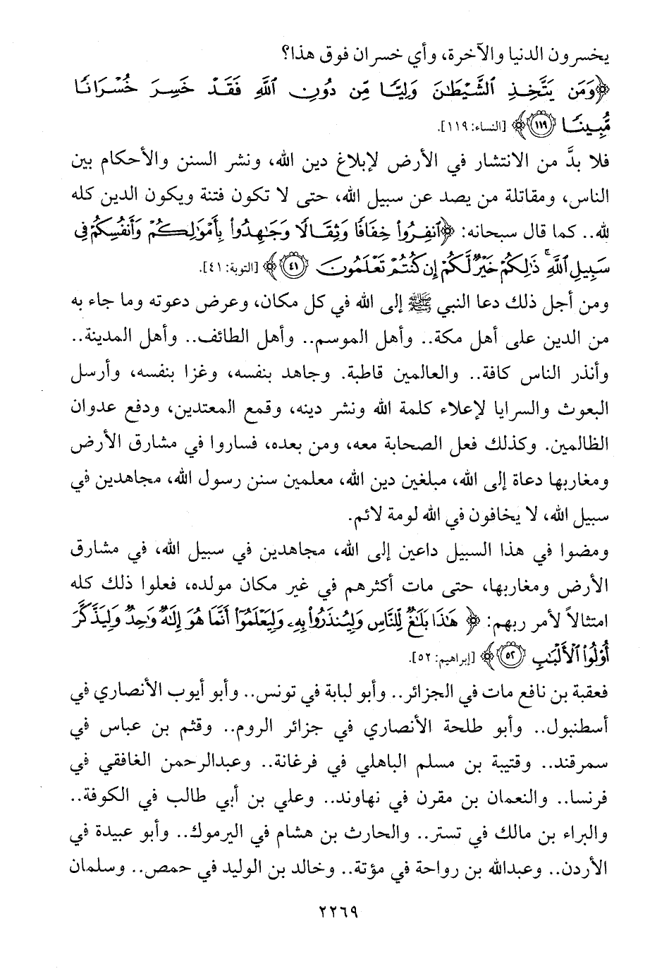 ومن أجل ذلك دعا النبي - صلى الله عليه وسلم - إلى الله في كل مكان، وعرض دعوته وما جاء به من الدين على أهل مكة .. وأهل الموسم .. وأهل الطائف .. وأهل المدينة .. وأنذر الناس كافة .. والعالمين قاطبة. وجاهد بنفسه، وغزا بنفسه، وأرسل البعوث والسرايا لإعلاء كلمة الله ونشر دينه، وقمع المعتدين، ودفع عدوان الظالمين. وكذلك فعل الصحابة معه، ومن بعده، فساروا في مشارق الأرض ومغاربها دعاة إلى الله، مبلغين دين الله، معلمين سنن رسول الله، مجاهدين في سبيل الله، لا يخافون في الله لومة لائم.